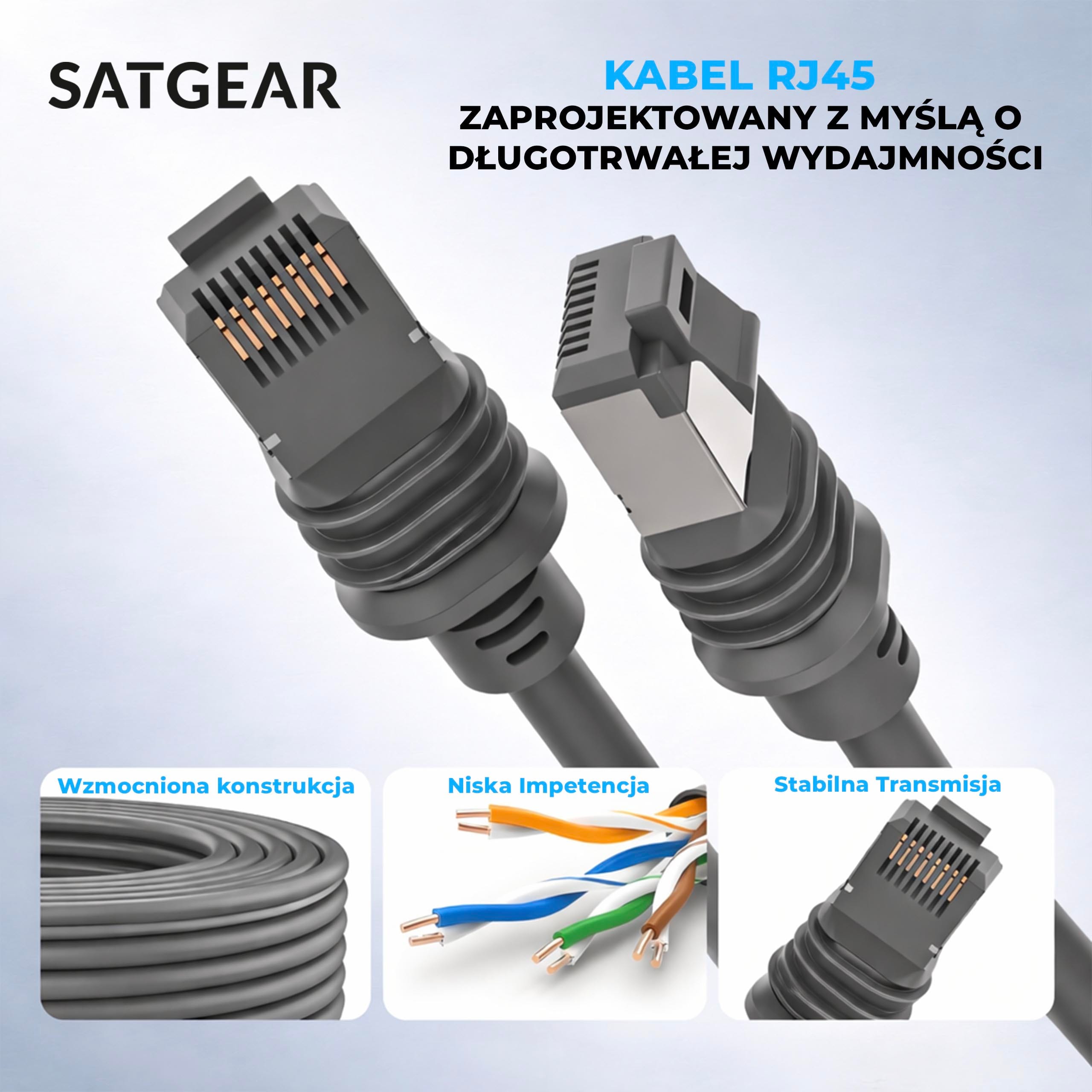 Pogrubiona izolacja chroni przed przetarciami, plątaniem i uszkodzeniami mechanicznymi. Solidne wtyki RJ45 gwarantują mocne osadzenie w porcie i zapobiegają przypadkowemu wypięciu.